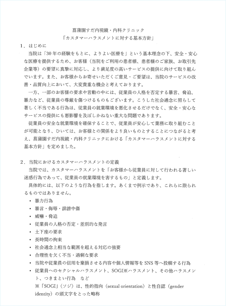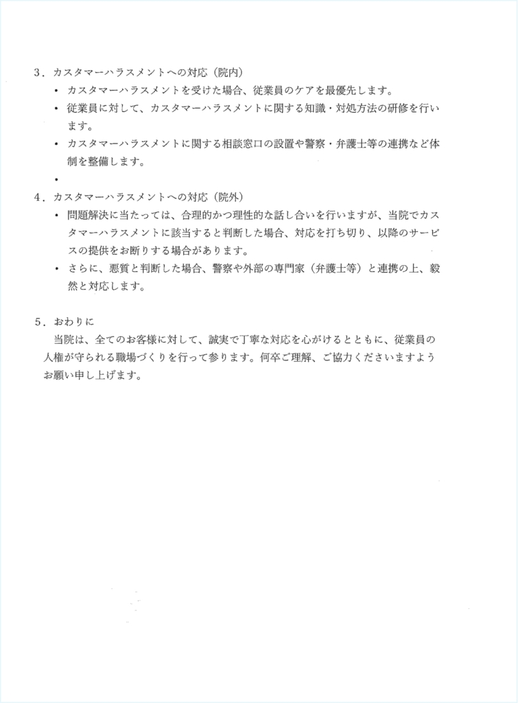 当クリニックでは、すべての患者さまに安心・安全な医療を提供することを最優先に考えており、患者さまとの信頼関係を築き、適切な診療を提供するために、スタッフ一同努めております。昨今、誹謗中傷や暴言などのカスタマーハラスメント(カスハラ)があり、これに対する対応方針を公表します。